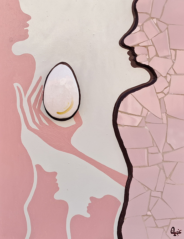 Oil on wood and mosaic, 45 cm x 35 cm, 2025.